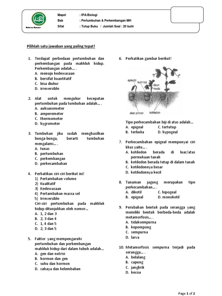 Uh Pertumbuhan Dan Perkembangan 20 Soal