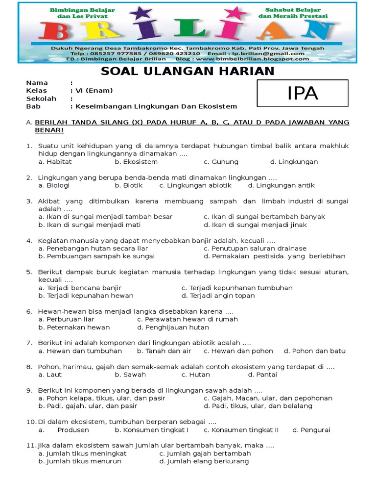 Soal Ipa Kelas 6 Sd Bab Keseimbangan Lingkungan Dan Ekosistem Dan Kunci Jawaban Bimbel Brilian