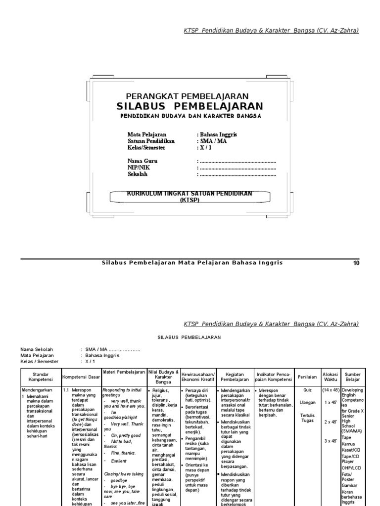 Pos tentang KTSP Bahasa Inggris Kelas X yang ditulis oleh cevithea. Kimia kkm ktsp ktsp bahasa inggris ktsp bahasa inggris sma ktsp sma mata pelajaran matematika model ktsp pai. Tujuan artikel kali ini adalah membagikan dokumen penting untuk tenaga pendidik guru yakni silabus dan RPP Pendidikan SMAMA Kurikulum 2013 Revisi Tahun Terbaru.
