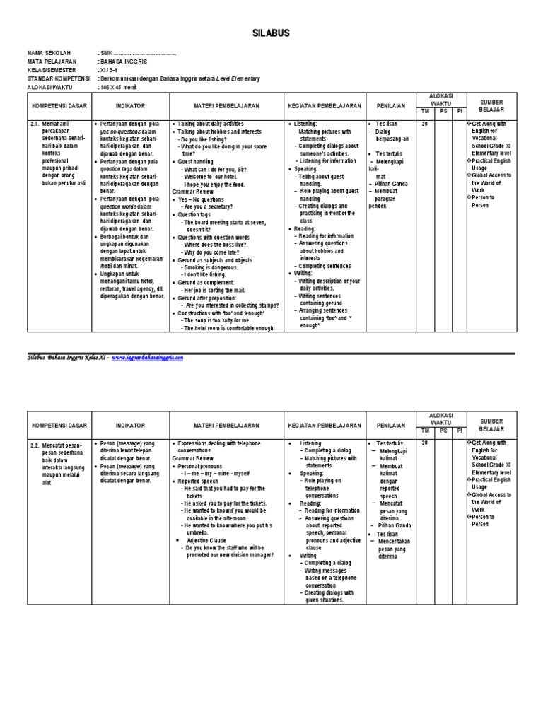 Download Silabus Bahasa Inggris Terbaru Smk Kelas 11 Edisi 2017 PDF 700 MB - SamPDF Download Silabus Bahasa Inggris Terbaru Smk Kelas 11 Edisi 2017 PDF secara gratis di SamPDF. Silabus Bahasa Inggris SMA K13 Pdf- Bagi peserta didik SMAMASMKMAK di Indonesia belajar bahasa Inggris bukan pengalaman pertama tetapi kelanjutan dari yang sudah didapat di SMP. Format silabus dalam bentuk file doc jadi lebih mudah untuk dibuka dan diubah sesuai dengan kebutuhan.