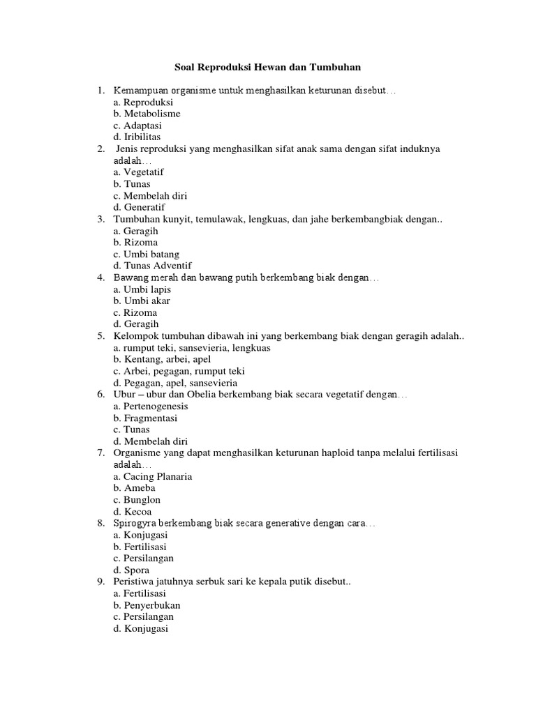 Soal Sistem Perkembangbiakan Tumbuhan Dan Hewan Kelas 9 Smp Mts Kurikulum 2013