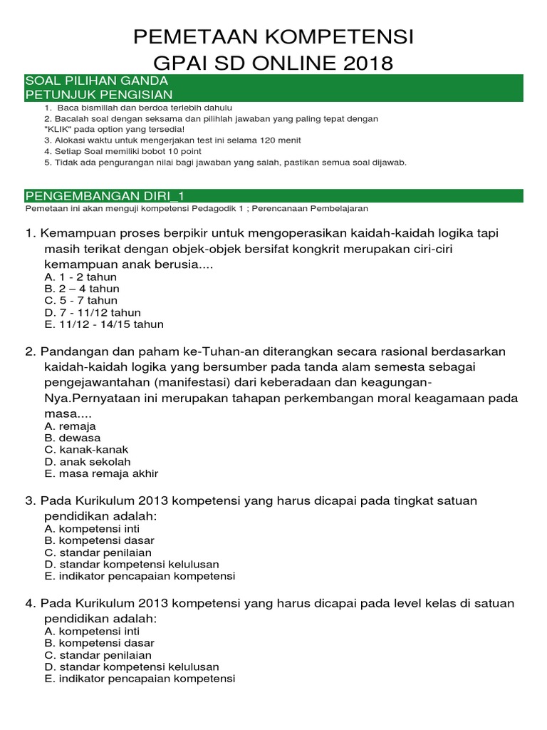 Soal Pemetaan Kompetensi Gpai Sd Online 2018 Docx